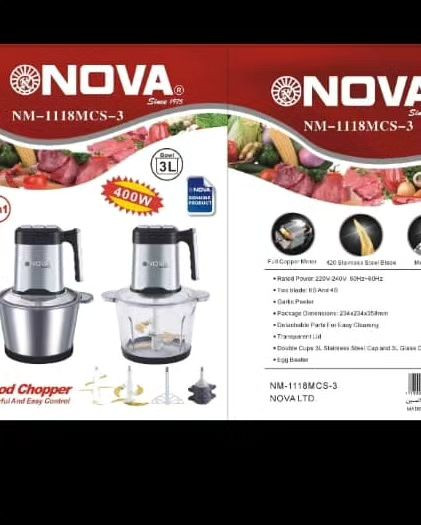 خردکن نووا 3 لیتری شامل یک عددکاسه استیل یک عدد کاسه شیشه ای یک عدد تیغه 4تایی یک عدد تیغه 6 تایی یک عدد تیغه پوست کن سیر سه دور سرعت 400 وات . . . . . . . . .